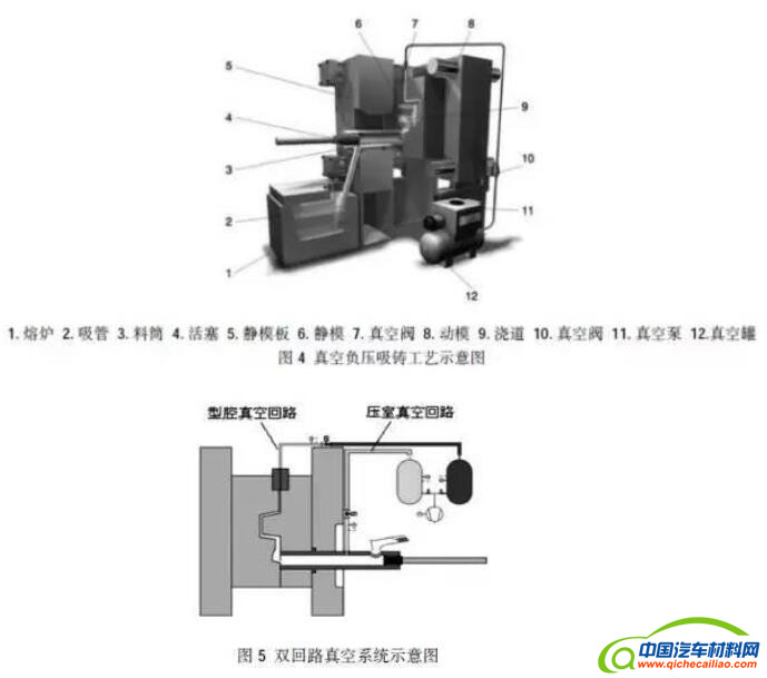 德国富来公司开发了真空负压吸铸工艺,其工作原理如图4 所示,整个压铸过程都在高真空状态下(低于30 mbar)进行。金属液通过真空状态下的模具、压室和吸管在无氧化情况下由吸管从熔炉中吸入,脱模剂的蒸汽也由真空系统排出。上述真空负压吸铸工艺的主要特点是:在开始定量浇注时,整个系统就处于高真空状态下;在定量浇注过程中,可有效地排出型腔和金属熔体中的气体;浇注过程中金属熔体无氧化;浇注过程中无热损失,可以采用更低的浇注温度进行浇注,并在实时监控下进行无扰动层流充填。上述工艺已经成功地应用于汽专家论坛车结构铸件的批量生产,为高质量的轻合金铸件的应用提供了先进的成型方法与工艺。
