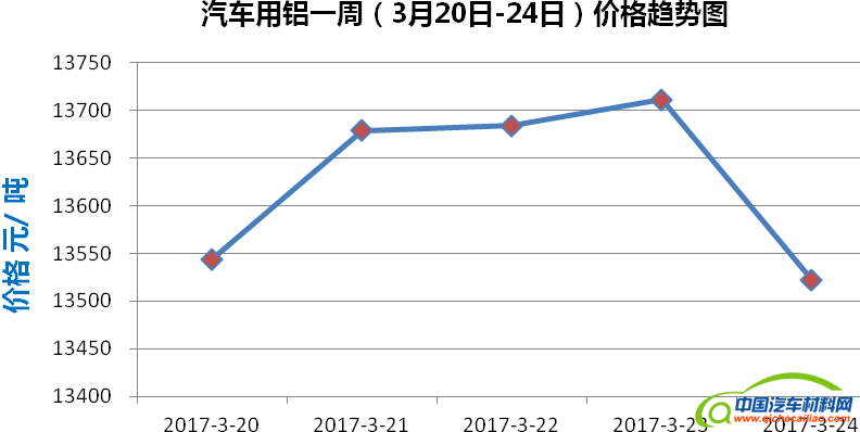 汽车用铝本周内价格波动较大:3月20日-23日,价格上涨,涨幅为167元/吨;23日-24日,价格下跌至20日水平,达到13523元/吨。汽车用铝本周均价为13628元/吨,较上周下跌0.43%,较2月份均价下跌0.82%。