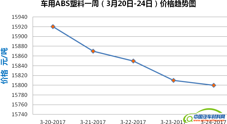 ABS塑料本周呈快速下跌趋势,一周内跌幅达120元/吨,本周五价格跌至15800元/吨。车用ABS塑料本周均价为15850元/吨,较上周下跌1.24%,较2月份均价上涨0.52%。