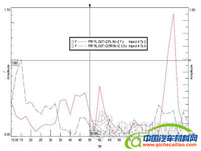 分别对原地试验和滑行过减速带试验所得数据分别做传递函数分析(FRF),FRF方法是Test. Lab软件系统后处理功能,可以很方便得出输出/输入的传递特性(如图7和图8所示)。我们不难看出引起车内噪声和振动的主要是由于发动机及传动系统(尤其是副车架)而来的振动。