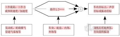 假设系统是线性时不变的,则车内目标点的声压或振动水平等于各激励源以工作载荷激励时沿不同路径传播到车内的能量的叠加(如图1所示)。TPA的目的是研究能量在这些路径上的传播情况。