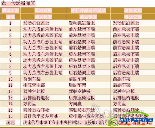 测试系统的数据采集和分析部分采用LMS Test. Lab 8A/Advanced Signature Testing模块,在将计算机、采集前端和传感器连接好后,通过通道设定,测量带宽和触发设置以及输入信号量程的自动设置,软件会自动完成数据采集和存储。值得一提的是必须在功能选项“add-in”中勾中“Time Recording During Signature Testing”功能模块,以便在接下来的分析中运用测试数据。各种工况传感器布置位置见下表。