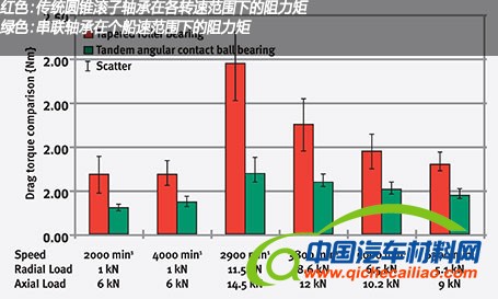 舍弗勒集团近期正在开发一种新的串联轴承,致力于达到传动效率最大化的目的。他们开发出新一代高效率轴承被证明能够减少50%的阻力矩,并且能够提高燃油经济性1.5%。串联轴承的另一项优势在于,相比传统的圆锥滚子轴承,其摩擦阻力要小得多,相应的,在工作中产生的热能也会减少。这样就减轻了油冷却器的负担,延长其使用寿命,并且可以节省大量的用于冷却车轴的油液。串联轴承和圆锥滚子轴承都对轴向定位和推力负荷管理提供了收益;然而,串联轴承工作中产生的摩擦力要比圆锥滚子轴承小得多,这将大大提高效率收益。
