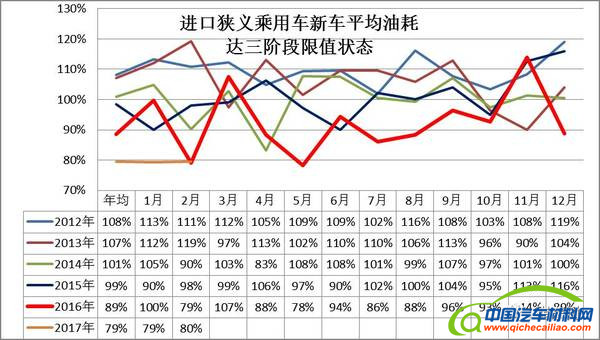 17年2月的国产狭义乘用车的汽油车达到三阶段油耗限值的91%,相对16年同期的95%改善。15年的新车平均油耗94%属于较快改善状态,16年有降4个点的趋势。17年初新品油耗降低速度较慢,与政策要求仍有差距。