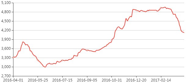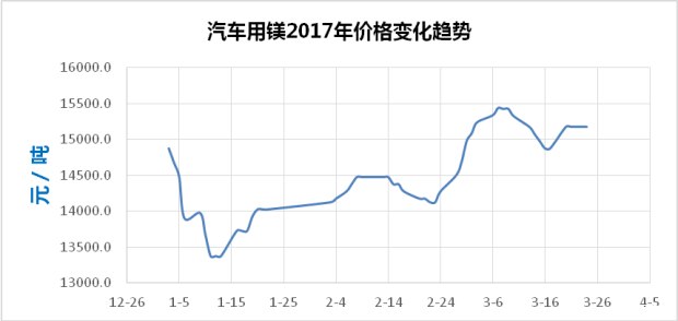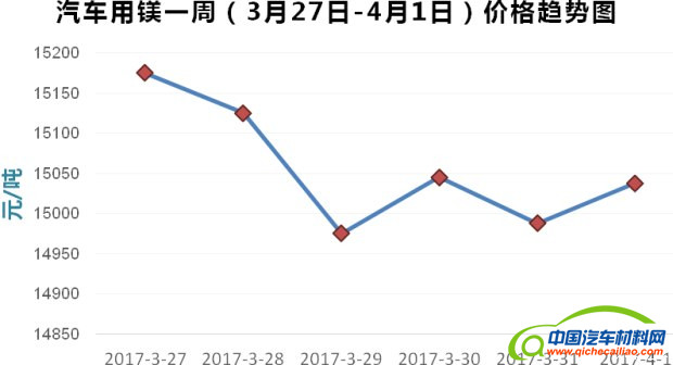 汽车用镁本周内价格总体呈下降趋势:3月27日-29日价格大幅下跌,跌幅达200元/吨;3月29日-4月1日价格出现小幅度波动。汽车用镁本周均价为15061.5元/吨,较上周下跌0.75%。