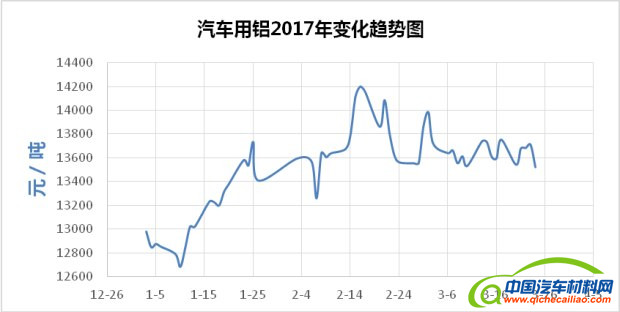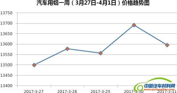 汽车用铝本周内价格变化如下:3月27日-28日,价格小幅上涨;28-29日价格略有下跌;29-30日价格上涨,1天内涨幅为135.6元/吨;30-31日价格有所下跌。汽车用铝本周均价为13584.4元/吨,较上周下跌0.32%。