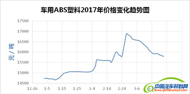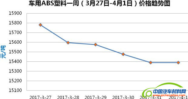 ABS塑料本周呈下跌趋势,一周内跌幅达390元/吨,4月1日价格跌至15390元/吨。车用ABS塑料本周均价为15534.17元/吨,较上周下跌1.99%。