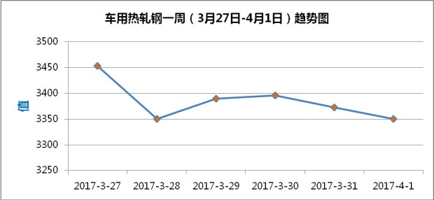 热轧钢本周内价格整体较为平稳:3月27日-28日,价格下跌,跌幅为103;3月28日—4月1日,价格有小幅波动。车用热轧钢本周平均价格指数为3385.33,较上周下跌5.25%。