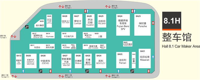 | 8.1H展馆 | 保时捷,玛莎拉蒂,福建奔驰,比亚乔集团,哈曼,法拉利,迈凯伦,乔治巴顿,星驰,上喆,霍默,宾利,兰博基尼,巴博斯,劳斯莱斯,哈雷戴维森,卡尔森,罗伦士,阿斯顿马丁,中欧房车,前途,星客特, |
