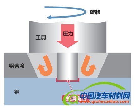 | 图3 FSW的接合原理 使顶端设有突起的圆筒状工具旋转的同时对其进行按压,通过工具旋转产生的摩擦热使铝合金变成塑性流动状态,以此完成接合。 |