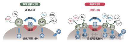 | 图7 原来的催化剂与新型催化剂的比较 (a)原来的催化剂因Pd的氧化还原反应循环较慢,净化性能不足。(b)新型催化剂通过缩小Pd催化剂的粒子尺寸,加快了氧化还原反应的循环速度。 |