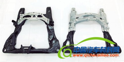 老款雅阁将发动机及转向齿轮箱安装在井字形钢制副车架上,通过改变安装在副车架上的压铸成形铝合金部件将直列4缸发动机车型与V型6缸发动机车型区分开来。该铝合金部件是以螺栓固定安装的〔图2(左)〕。