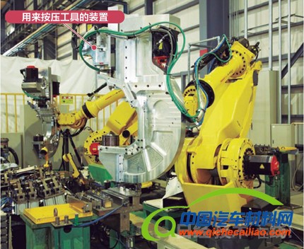 本田还新开发了接合装置。原来的FSW装置需要以重达约1tf(9.8kN)的负荷将工具按压至接合部分,因此是一种安装面积为49m2左右的大型门式设备。这种装置无法放置在汽车部件制造现场。于是本田在机器人手臂顶端安装了C型架,然后在C型架上部安装了FSW接合装置(图5)。因为按压工具的反作用力由C型架下侧承受,所以不会对机器人施加很大的反作用力。这样一来,装置的安装面积便缩小到了5m2左右,只有原来的约十分之一。