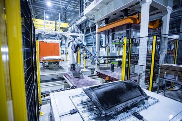 康得复材工业4.0版智能化生产线,可以实现HP-RTM、Surface-RTM、WCM、PCM、CF-SMC等先进工艺下碳纤维部件的量产,所生产的碳纤维部件包括汽车碳纤维主承力结构件、次承力结构件以及外观覆盖件。全自动化的生产模式使单个零部件的生产节拍最快达到2~3分钟,生产线上大吨位、大台面的压机使得像汽车引擎盖、顶盖以及侧围等这样较大面积零部件的高质量量产成为可能。