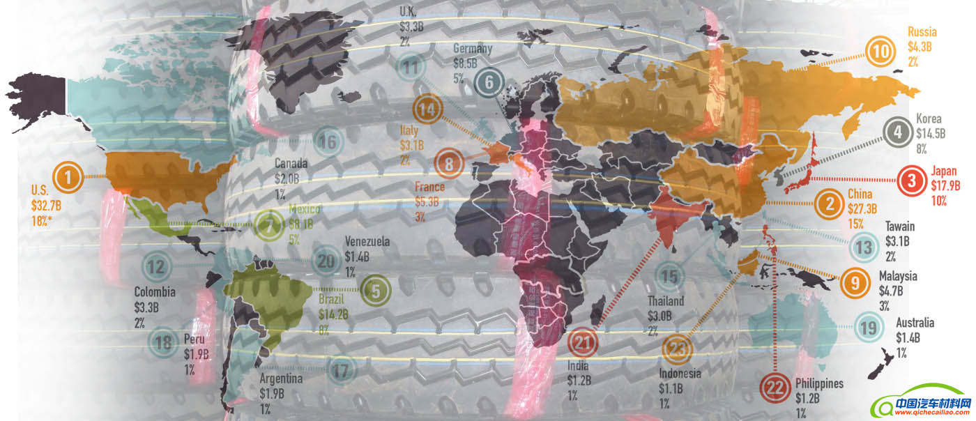 根据轮胎商业的产能数据推算,到2022年全球轮胎市场将超过3192亿美元(22300亿人民币),主要由于汽车销量有所增加,特别是亚太地区大幅扩张。 在2016年,全球轮胎市场已经明显以亚太地区为主。由于该地区的橡胶生产充足,劳动力成本低廉和政府政策有利,在该地区的轮胎制造厂占全球的60%以上。
