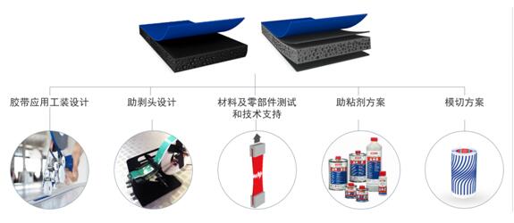 为达到最佳的工艺效果、最大程度实现tesa® ACXplus 产品解决方案在时间节约及可靠性方面的优势,德莎为汽车行业客户提供系统的技术服务,包括胶带应用工装设计、助剥头设计、材料及零部件测试、助粘剂和定制化的模切方案等。