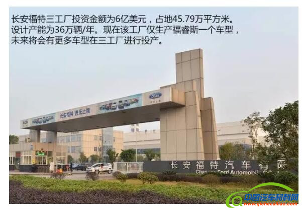 长安福特重庆第三整车厂于2014年正式投产,总投资6亿美元,目前年产能为36万台。第三整车厂目前只生产福特热销的福睿斯车型。