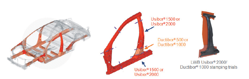 通过激光拼焊板技术,能够将Usibor® 2000材料与Ductibor® 1000材料结合,制造一体成形零件。这一技术使得汽车厂商能进一步优化车辆设计,将不同牌号的钢材应用到适当的零件部位,在有效提高车辆安全性能的同时显著降低车身重量,并且能节约材料成本、优化制造流程从而减少综合成本。