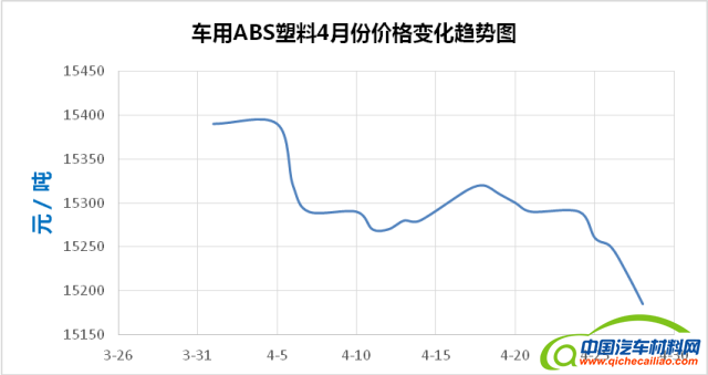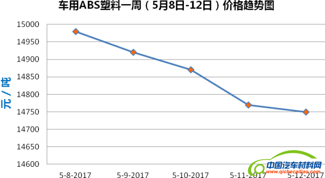 ABS塑料本周价格整体呈下跌趋势,一周内跌幅达230元/吨,本周五价格为14750元/吨。车用ABS塑料本周均价为14858元/吨,较上周下跌1.62%,较4月份均价下跌2.83%。