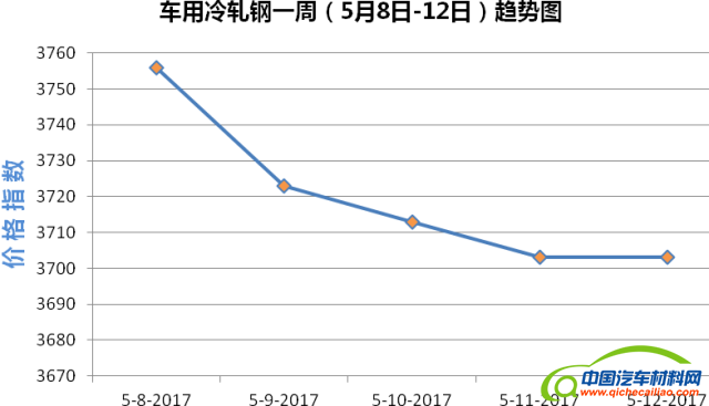 冷轧钢本周价格指数持续下跌,一周内跌幅为53。车用冷轧钢本周平均价格指数为3719.6,较上周下跌2.89%,较4月份平均价格指数下跌2.84%。