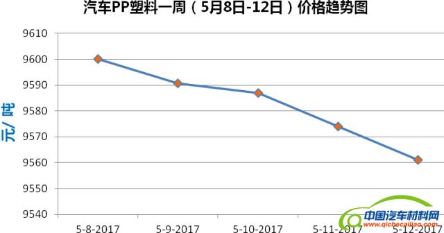 PP塑料本周内价格呈下跌趋势,一周内跌幅为38.89元/吨,本周五PP价格降为9561.11元/吨。PP塑料本周均价为9582.59元/吨,较上周下跌0.34%,较4月份均价下跌1.04%。