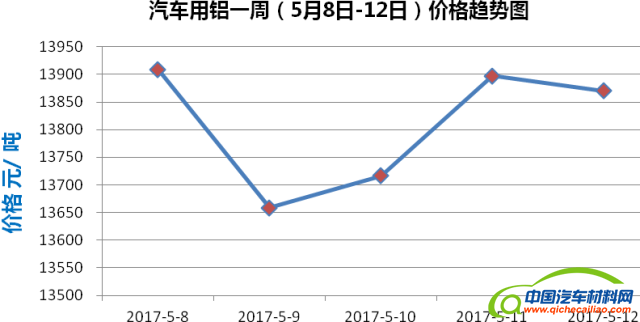 汽车用铝本周内价格变化较大:5月8日-9日,价格下跌,跌幅达250元/吨;5月9日-11日,价格回升;5月11日-12日,价格又略有下跌。本周五价格为13870元/吨。汽车用铝本周均价为13810元/吨,较上周下跌0.91%,较4月份均价下跌1.90%。