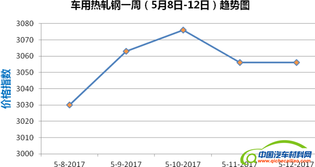 热轧钢本周内价格变化如下:5月8日-10日,价格指数上涨,涨幅为46;5月10日-2日,价格指数下跌。车用热轧钢本周平均价格指数为3056.2,较上周下跌1.69%,较4月份平均价格指数下跌1.76%。