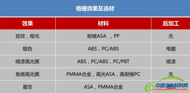 其中,高光黑的实现方式主要是用PC/ABS、PC/PBT等注塑毛坯件,然后喷高光漆,但随着环保理念的深入,PMMA类免喷涂方案也越来越多成为选择。格栅效果及选材大概可总结为: