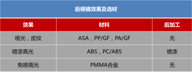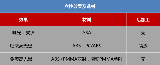 一般采用ABS或者PC/ABS喷漆实现,但现在更多采用的是ABS加PMMA双射成型实现,其中ABS提供韧性,PMMA提供黑亮的外观效果。过随着增韧PMMA的出现,采用直接注塑成型可实现减薄、简化工艺等效果,也吸引了越来越多的主机厂。中立柱的效果及选材大概可总结为: