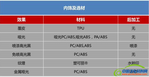 综上,汽车内外饰件不论是在选材还是在色彩和工艺方面都向着多元化的方向发展。高光、免喷涂、水转印等新技术新材料也越来越多的被接受和应用,成为汽车内外饰设计的新潮流。相信随着汽车工业的发展,汽车内外饰材料将在满足性能要求的前提下,更多的注重材料的美学设计,以不断创新的外观效果来满足和吸引更多的消费者。