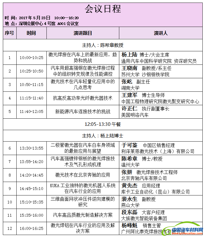 2017年5月23日,由广东省激光产业技术创新联盟、广东省激光行业协会、通用汽车中国科学研究院、中国激光智造技术创新平台、湖北省暨武汉激光学会、中国光学光电子行业协会激光分会、深圳市科学技术协会主办的;《激光制造商情》、广东省激光行业协会承办的;华南理工大学机械与汽车工程学院、广东省激光行业协会金属加工委员会协办的“中国先进激光与汽车轻量化技术大会”,将在深圳会展中心与“亚洲激光论坛”同期举行。