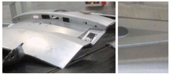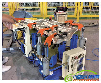 江淮也开展了对铝合金发盖内外板的工艺开发与研究,图3为发盖内板总成自冲铆实物。以发盖内板为例,原内板材质为DC03,零件重量为10.563 kg,材质变更为5182铝合金后,零件重量为5.184 kg,减重比达到50.92%。