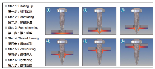 FPS工艺是通过高速旋转使板料热变形后攻丝铆接的冷成型工艺,其原理详见图4。FPS的优点为单面连接工艺使型材及小孔洞连接成为可能,在车身上往往用于一般铆接无法顺利完成的部件(如连接空间小、空腔结构等);可连接不同的材料;FPS的局限性为连接点需要高的刚性支撑;因螺钉为可拆卸,车身长期使用可能存在脱落问题,造成强度不足;工艺时间需要5~8 s;铆钉正反面均有较大的凸起保留;设备成本高,单台成本接近100万元,因此,不建议车身上大规模应用。FPS工艺主要应用于前舱、门槛及行李箱隔板等部位。