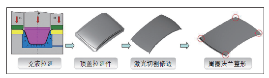 江淮发动机盖内板采用的是材质为5182的铝板,顶盖及发盖外板采用材质为6106的铝板(参见表1)。其中顶盖外板在CAE成形性分析时发现,充液拉延后尖点处整形开裂。对于尖点整形开裂,冲压工艺一般使用过拉延技术,在拉延时储料,以减少整形时尖点的材料流动,从而优化开裂。通过冲压CAE分析及工艺优化,最终产品成形性良好,质量精度达标。铝合金顶盖充液成形工艺见图1。