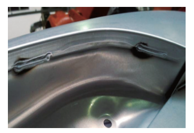 铝的点焊工艺是在电极压力下,靠电阻热熔化铝材,将其连接到一起的工艺,主要用于铝合金同质材料之间的连接。铝点焊设备控制器要求控制准确、稳定,控制器焊接时间设置毫秒控制,焊接输出电流10 ms达到稳定状态。铝点焊一般采用复合电极来提高寿命,电极帽表面采用特殊的圆环式设计,可以在铝材表面产生不同的应力区,破坏氧化膜以得到可控制的电阻。铝点焊的优势是可以实现多种厚度材料组合的连接,工艺柔性好;铝点焊的静态强度及疲劳强度高;单步工艺时间可控制在3 s以内。铝点焊局限性主要体现在需要双侧进枪空间,同时因铝合金导电性较差,需要铝点焊电流一般达到40 000A,是普通点焊的4倍;靠近点焊的工装夹头必须采用非磁铁性材质;需要特殊的电极帽及修模器。铝点焊常用部位为侧围、发舱、地板及闭合件,效果见图5.