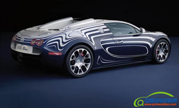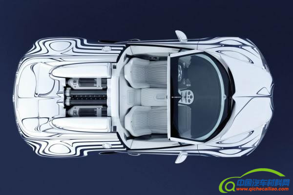 外观方面,从正面望去,前舱盖和发动机周围不对称的蓝色条细纹,就像是车行走中流动的光影,也契合了布加迪威龙来去无踪的作风。它车体上那些怪异的弯曲的白色装饰就是陶瓷了。陶瓷细节在车身内外随处可见,对车身整体做了很好的点缀。
