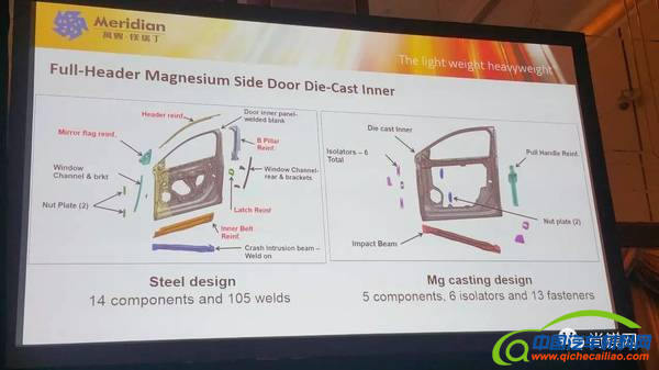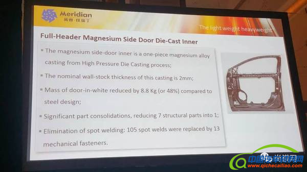 2.镁压铸侧门内部比钢结构节省了8.8公斤(或48%)的重量;
