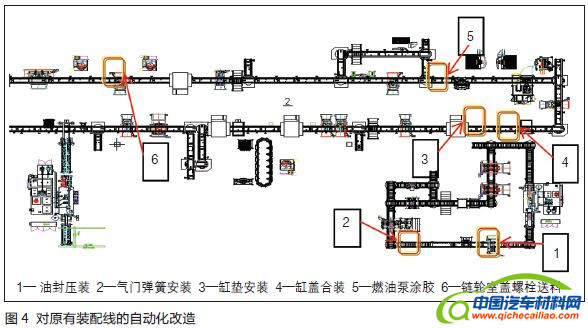 同时,我们也在着手进行原有生产线的自动化改造,对之前的手动装配工位,进行自动化手段替代。如图4 所示,油封压装、气门弹簧安装、缸垫安装、缸盖合装、燃油泵涂胶以及链轮室盖螺栓送料等部位,都可以通过优化进行自动化升级。