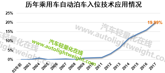 自动泊车入位系统的应用给驾驶者在停车入位方面带来了很大的便利,特别是对于新手驾驶者,该系统可帮助驾驶员更快的、自动地、正确地将汽车停入位泊车。该技术于2009年开始逐渐得到推广,2011年之后应用比例逐年快速增加。2016年上市的乘用车中,自动泊车技术应用比例达到了16.05%。2017年1-3月份上市的车型中,应用比例达更是达到了19.99%。