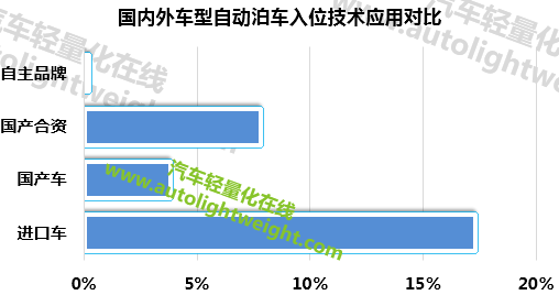 自动泊车入位技术最早于欧洲车型使用,目前,进口车型的使用率较高,达到17.34%。其中标配率为10.17%。而国产车由于成本问题目前的综合应用率仅为3.85%。