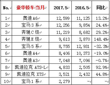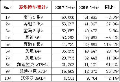 豪华轿车领域 本月榜单中,奥迪A6回归到榜首位置,而上月的冠军宝马5系下降到第五位,宝马3系和奔驰C级、E级紧随奥迪A6之后;累计榜单中,宝马5系仍是独占鳌头,但优势不大了,随后的三款车销量非常接近,都有夺魁的气质。