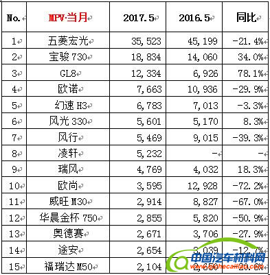 MPV领域 5月,MPV销量14.39万辆,同比下降15.6%,环比增长6.1%;1-5月累计销量83.39万辆,下降17.9%。本月榜单中,表现较好的宝骏730和别克GL8,分别增长34.0%和78.1%;累计排名中,正增长的只有别克GL8和艾力绅,新GL8提振了大型MPV的士气。