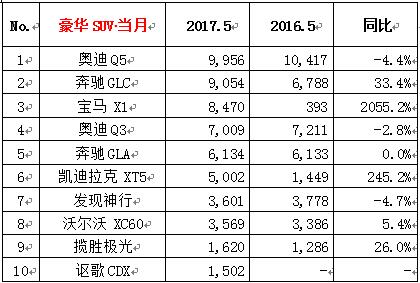 豪华SUV领域 本月奥迪Q5再跃巅峰,与奔驰GLC和宝马X1共同构成ABB三足鼎立局面;累计榜单中,前3(奔驰GLC、奥迪Q5、宝马X1)排名与上月一致,估计今后几个月才是ABB角逐豪华SUV市场见分晓的时候。
