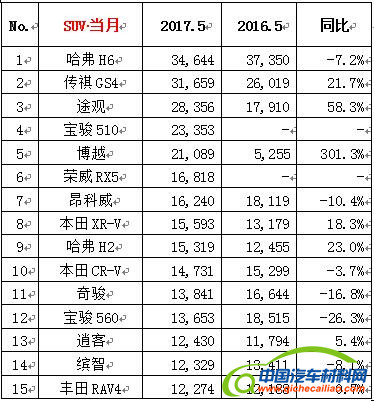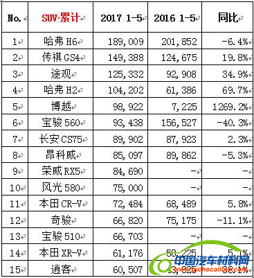 SUV领域 5月,SUV销量达71.85万辆,同比增长17.2%,环比增长4.3%;1-5月累计销量370.92万辆,同比增长17.2%,是乘用车中唯一增长的子市场。往年哈弗H6一尘绝迹的景象已经不再,取而代之的是群雄割据,如传祺GS4、途观、博越、本田XR-V和哈弗H2等,形成了集体上攻的局面;新车表现可圈可点的有荣威RX5、风光580和宝骏510。