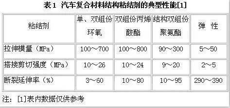表1为汽车复合材料三类结构粘接剂的典型性能,由于结构粘结剂的品种繁多,使用的要求又各不相同,所以应以实际使用结构粘结剂的性能为准,表中数值仅供参考。