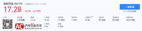 吉利从今年4月最低点的9.99港币一路上涨到最高的17.28港币,在两个多月时间里,涨幅超过60%。最大受益者是吉利大老板李书福以及管理层,李书福的财富也已经翻了六倍,按照福布斯公布了2017年全球富豪排行榜(财富计算截止日期是2017年2月17日),李书福以67亿美元的财富值超越长城魏建军(59亿美元)成为中国汽车业首富,而在2016年时,李书福才不过17亿美元的身家。