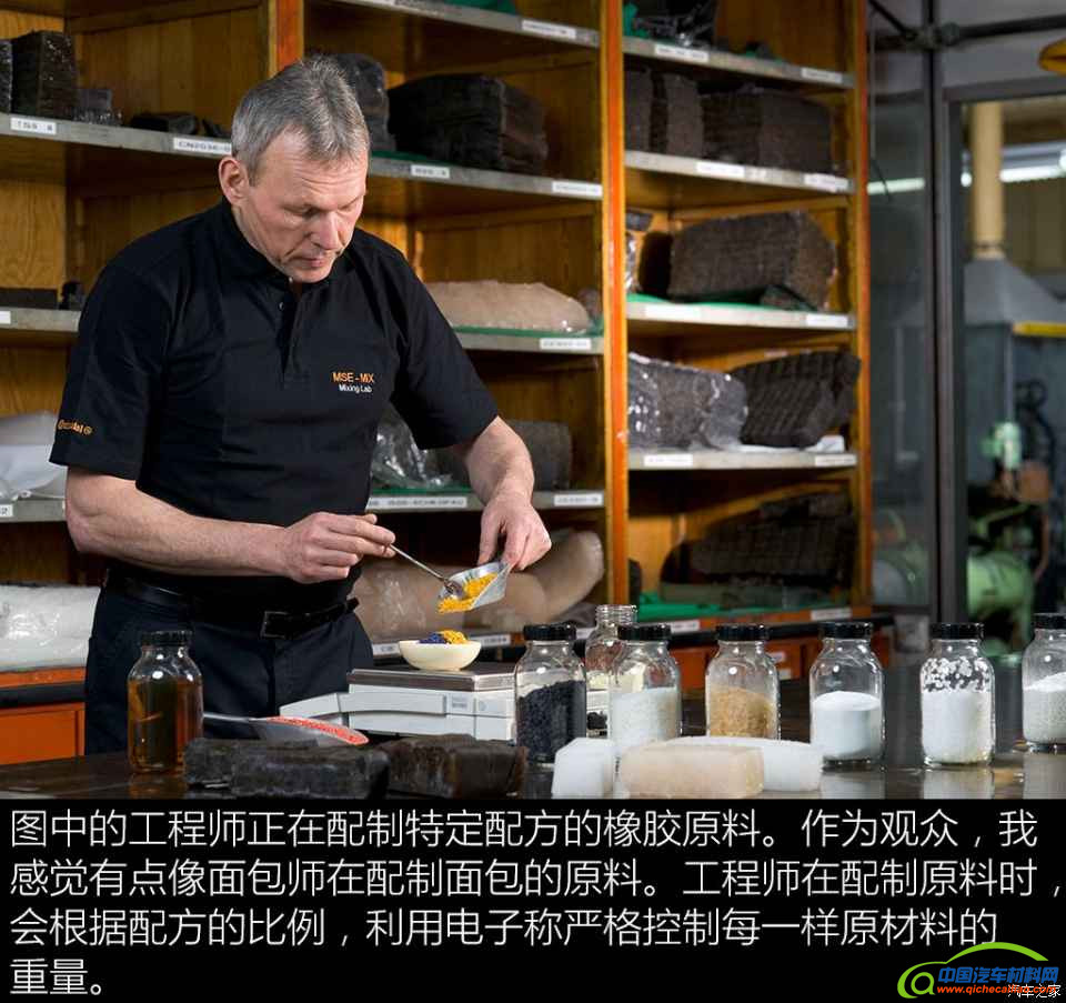我们首先参观的是制造轮胎橡胶测试样品的“Mixing Room”,中文译作“橡胶调配实验室”比较合适。工程师会在这里使用天然橡胶、聚丁橡胶、硅胶、碳黑、软化剂等材料制造出各种橡胶样品供试验部门进行相关测试,性能优异的样品才会被应用到量产的轮胎产品之上。