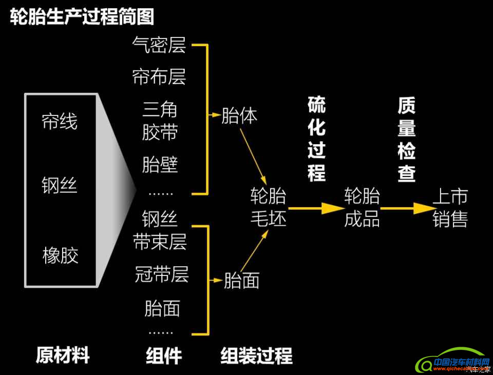 轮胎的主要原材料包括组成帘布层的帘线、组成钢丝带束层的钢丝以及各种配方的橡胶。轮胎的生产涉及到约10种不同配方的橡胶,包含15-20种不同的组件。这些组件包括气密层、帘布层、三角胶带、胎壁、缓冲层、冠带层、胎面等。各组间通过组装工序组成轮胎毛坯,然后通过硫化工序对毛坯进行加温加压硫化处理形成轮胎成品。轮胎成品经过目测以及机器的检查,合格后才能出厂。