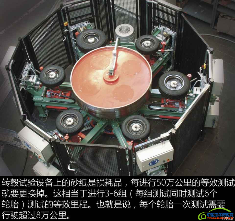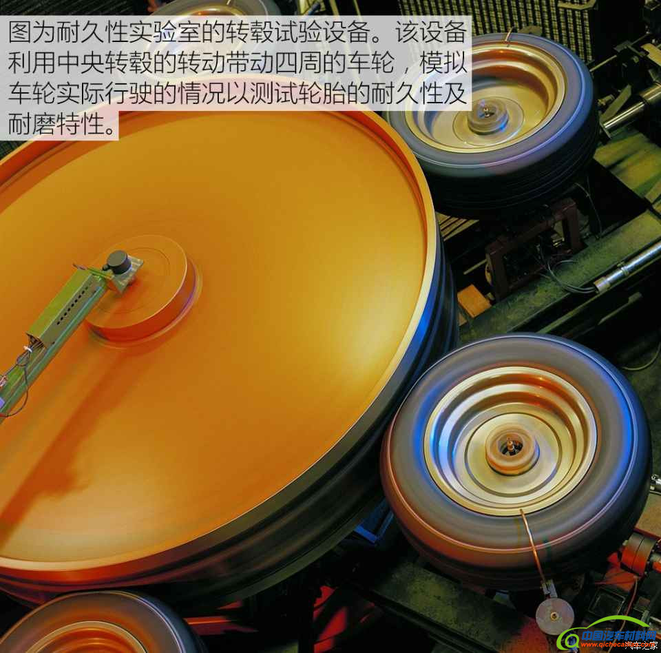 耐久性实验室通过转毂和转毂上的砂纸来模拟轮胎在实际路面上行驶的状况,看轮胎在实际行驶一定里程后,各项性能的衰减状况及内部结构的变化,从而在材料、花纹设计等方面进行优化,让轮胎产品在整个寿命周期内的性能更为稳定。
