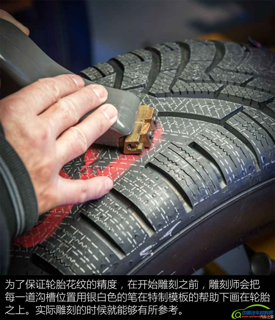 手工雕刻轮胎花纹也必须达到一定的精度,这样才能在实际的轮胎测试中验证花纹设计对轮胎性能的影响。马牌规定手工雕刻的轮胎花纹,其误差必须控制在0.2mm以内。
